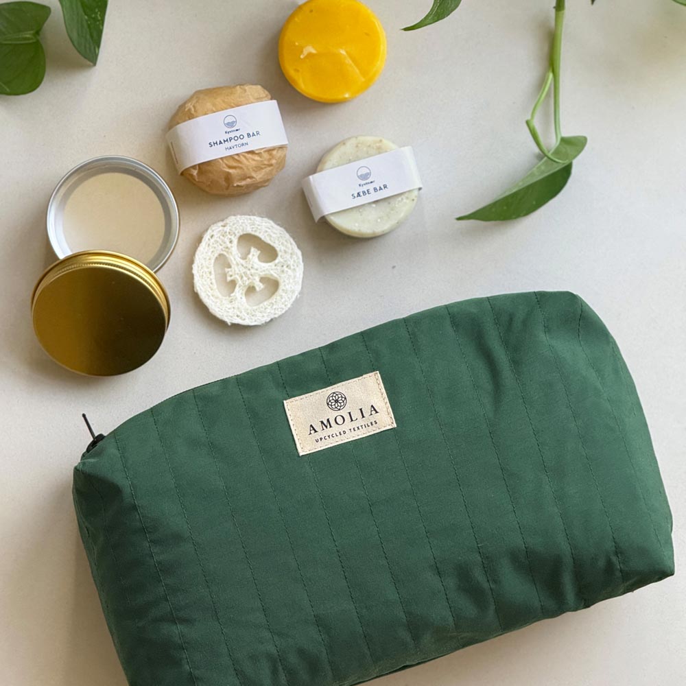 Billedet: Et af vores upcyclede toilettaske-gavesæt med Kystnærs sæbe- og shampoo-barer.