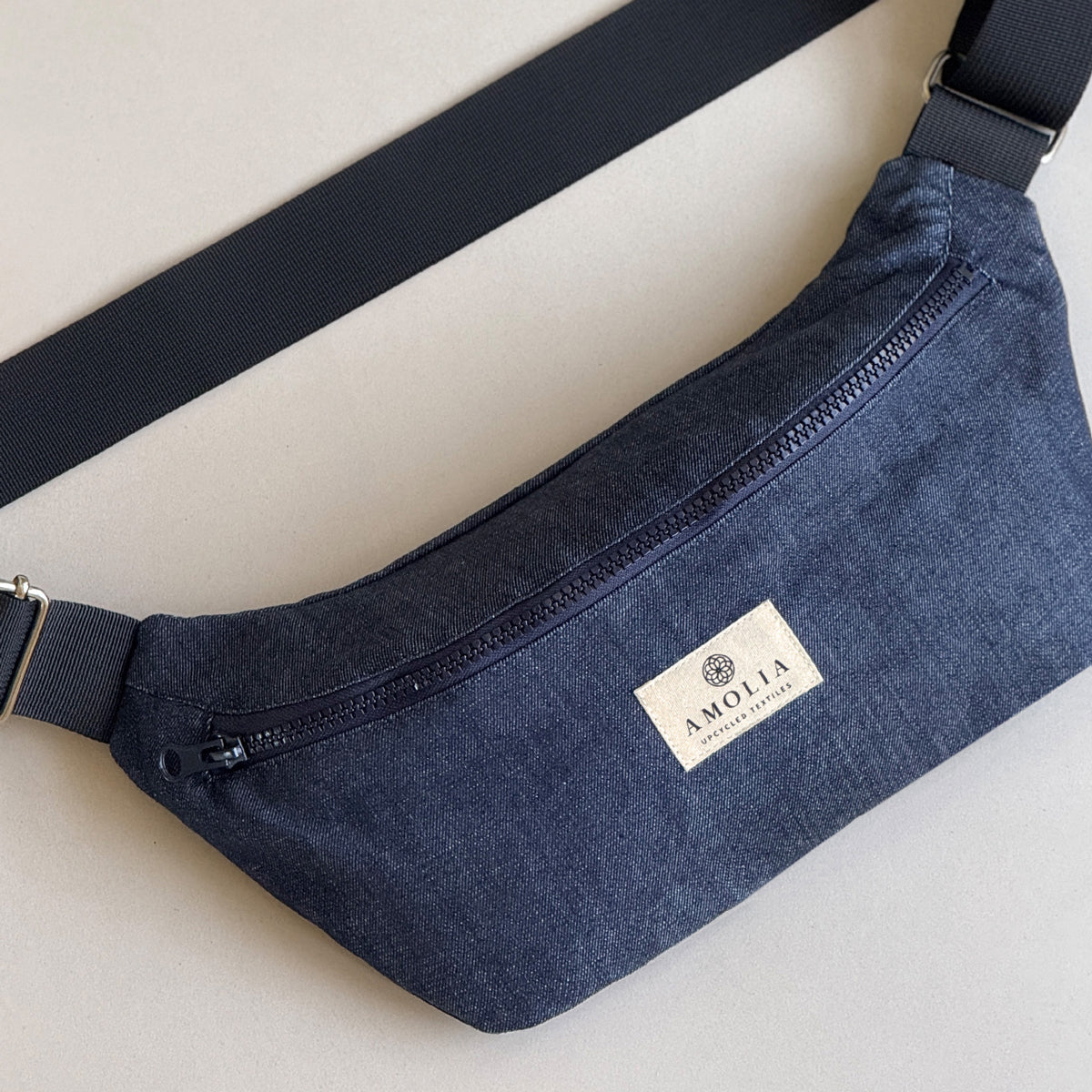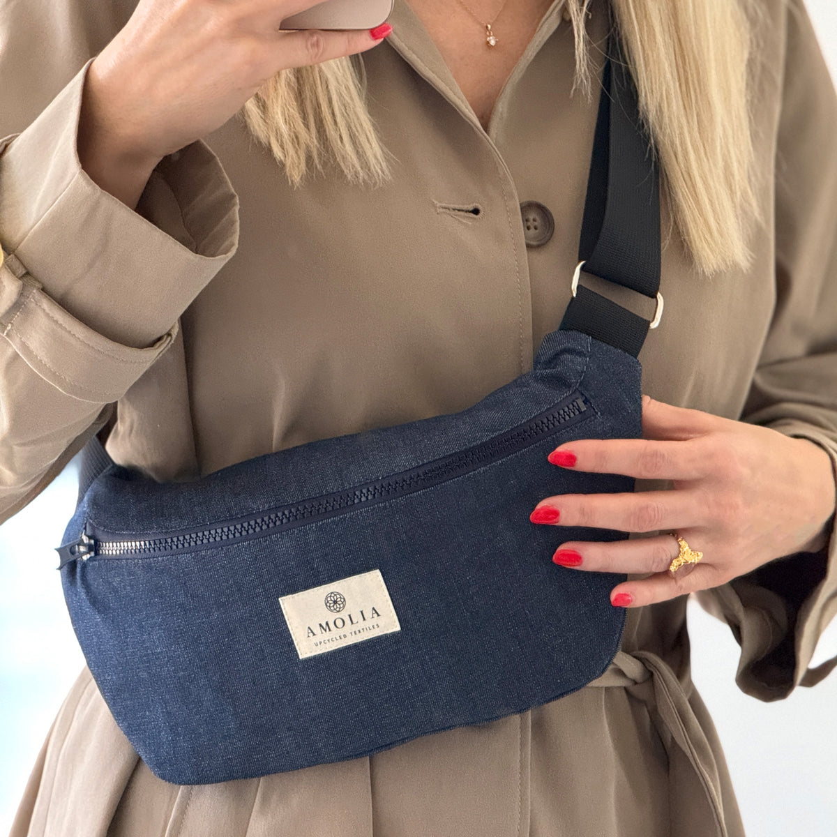 Vores upcycled skuldertaske er lige så smuk, som den er funktionel og er både den perfekte gave og en dejlig lille rejsekammerat. Vi producerer alle vores produkter ved at upcycle tekstilaffald fra vaskerier i Danmark. Dette er den mest miljøvenlig måde at håndtere kasserede tekstiler på. Upcycling er langt mere miljøvenlig og effektivt end recycling!