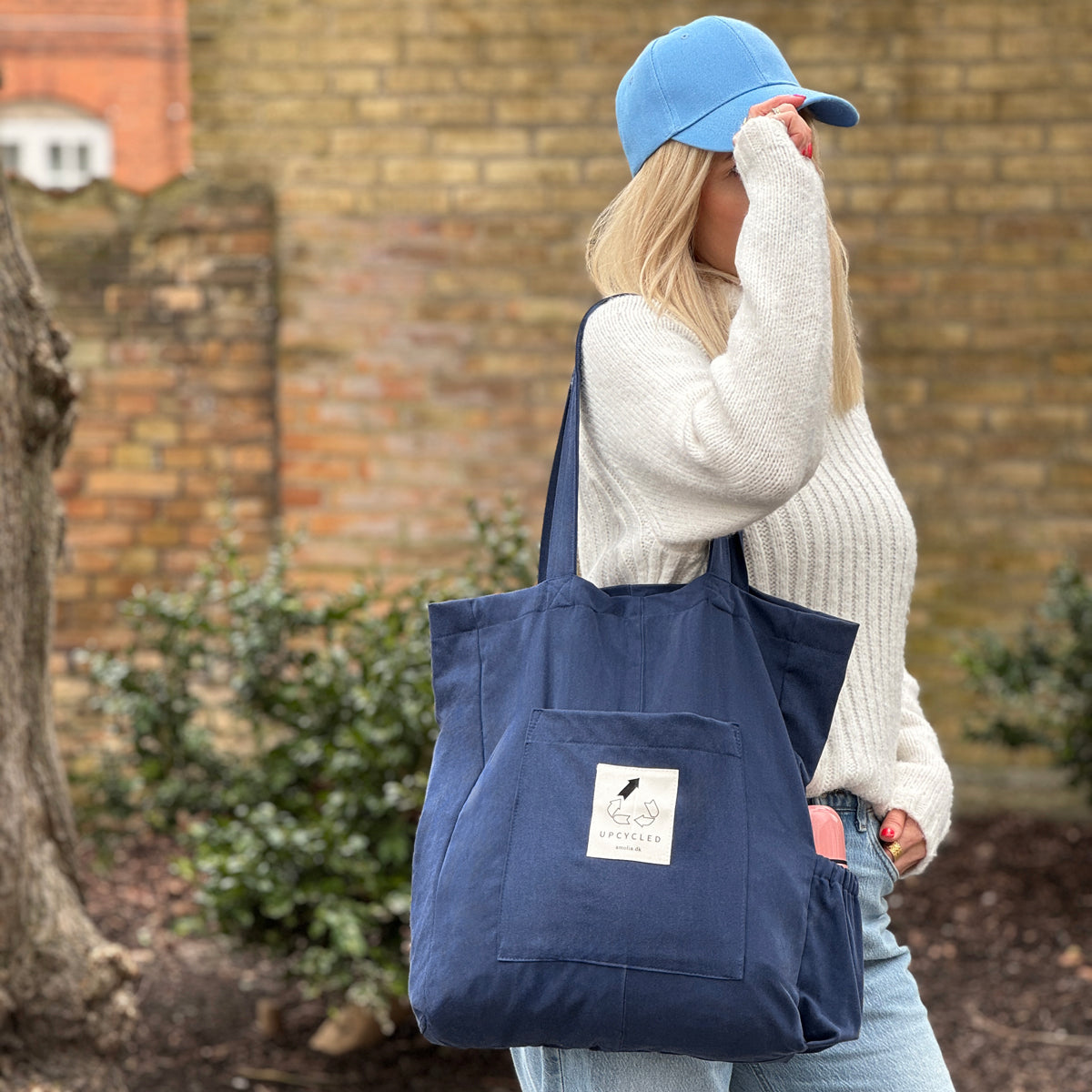 Vores upcycled mulepose med flaskeholder er lige så smuk, som den er funktionel og er både den perfekte gave og en dejlig lille rejsekammerat. Vi producerer alle vores produkter ved at upcycle tekstilaffald fra vaskerier i Danmark. Dette er den mest miljøvenlig måde at håndtere kasserede tekstiler på. Upcycling er langt mere miljøvenlig og effektivt end recycling!
