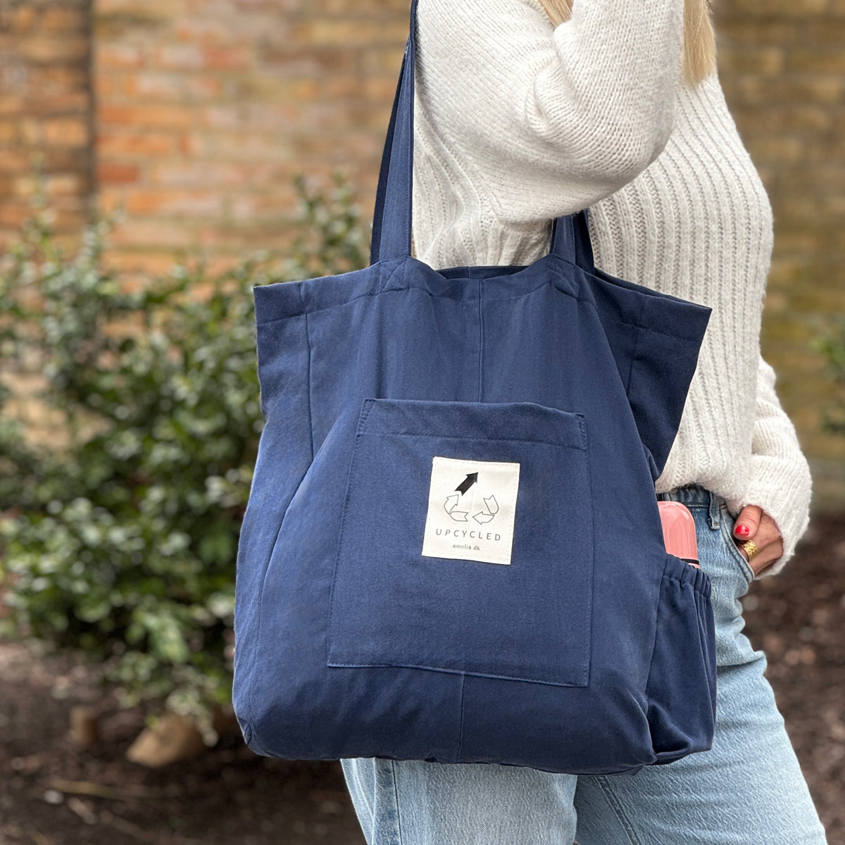 Vi hos Amolia tjekker kvaliteten af hvert et stykke, og syer det på gammeldags vis om til nye produkter, i stedet for at genbruge det mekanisk eller kemisk til nyt garn. Det er en lang og tidskrævende proces i mandetimer, men det holder vores genanvendelses linje så grøn som muligt. Ikke engang recycling kan følge med når vi snakke om at upcycle produkter. Det er den mest miljøvenlige måde at håndtere affaldet på, fordi det kun kræver meget lidt energi, og vand i forhold til et recycling produkt, hvor materialet skal nedbrydes og ofte blandes med polyester for at binde de kortere fibre sammen igen.